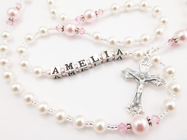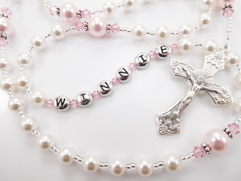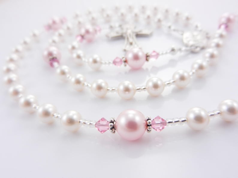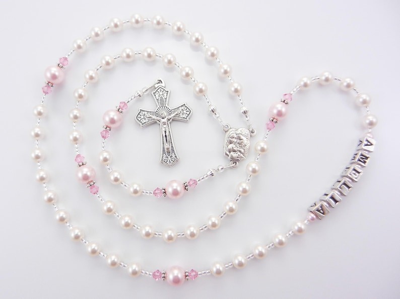 Dieser handgefertigte katholische Rosenkranz aus fünf Dekaden in Weiß und Rosa besteht aus hochwertigen österreichischen Perlen und Kristallen und wird mit einem Namen personalisiert. Das Rosa ist so dezent und süß. Erhältlich mit Tauf-, Erstkommunion-, Firmungs- oder anderen Medaillen. Er ist für jedes Alter und jeden Anlass geeignet. Weitere Informationen finden Sie unten.