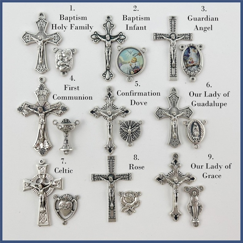 HERGESTELLT IN DEN USA! Die Mittelmedaille und das Kruzifix werden in Italien hergestellt. Die Perlen und das Fädelmaterial stammen aus Österreich, den USA und Japan.