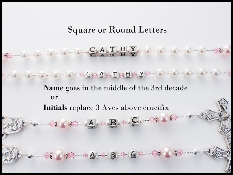 ~ Der Name kommt in die Mitte des 3. Jahrzehnts mit 5 Ave-Maria-Perlen auf beiden Seiten. Alle Buchstaben werden in den USA hergestellt.