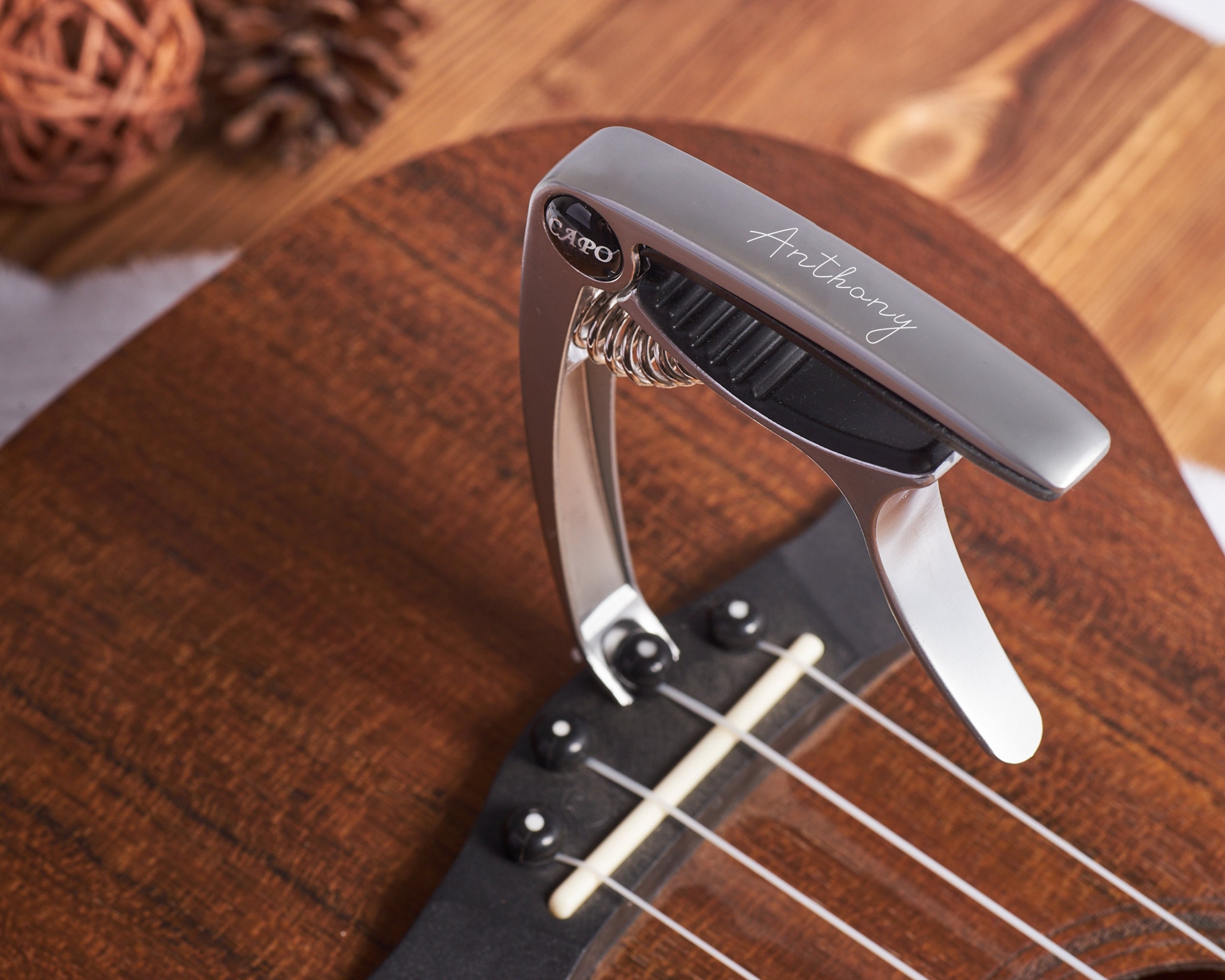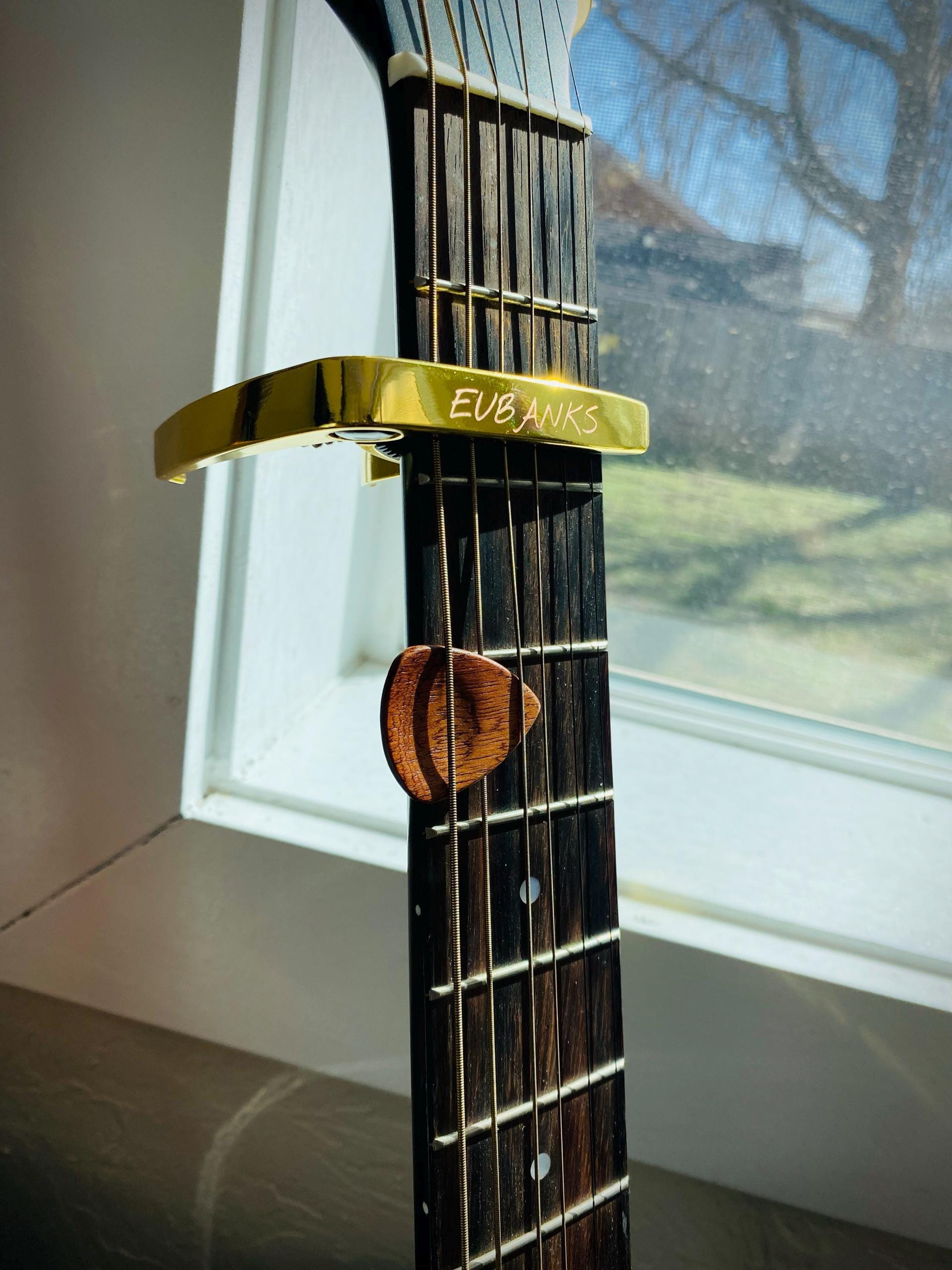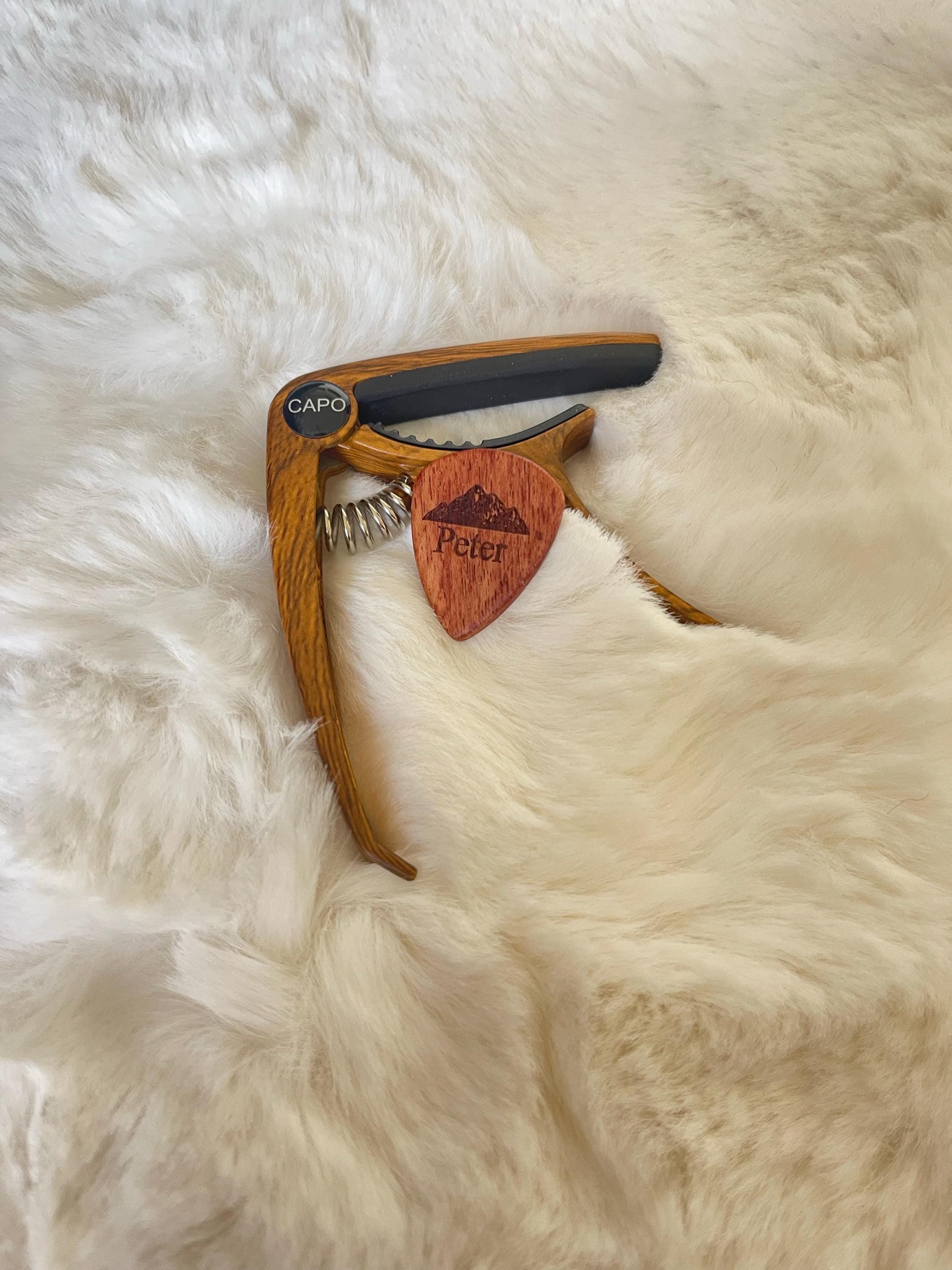Unser personalisierter Gitarren-Capo eröffnet Ihnen neue musikalische Ausdrucksmöglichkeiten. Dieser Capo verbessert nicht nur den Klang Ihrer Gitarre, sondern verleiht ihr auch eine persönliche Note, da er auf Präzision und Langlebigkeit ausgelegt ist.