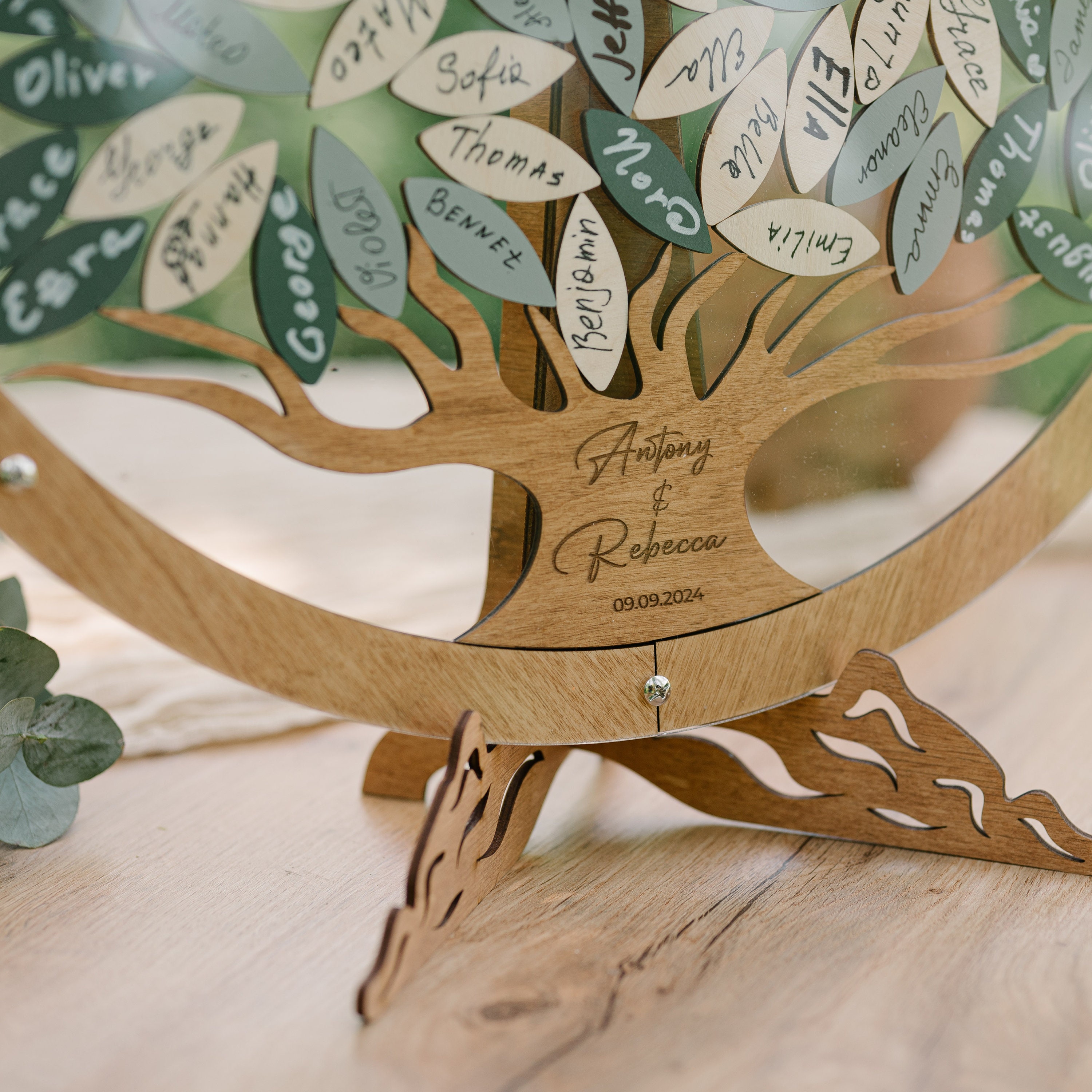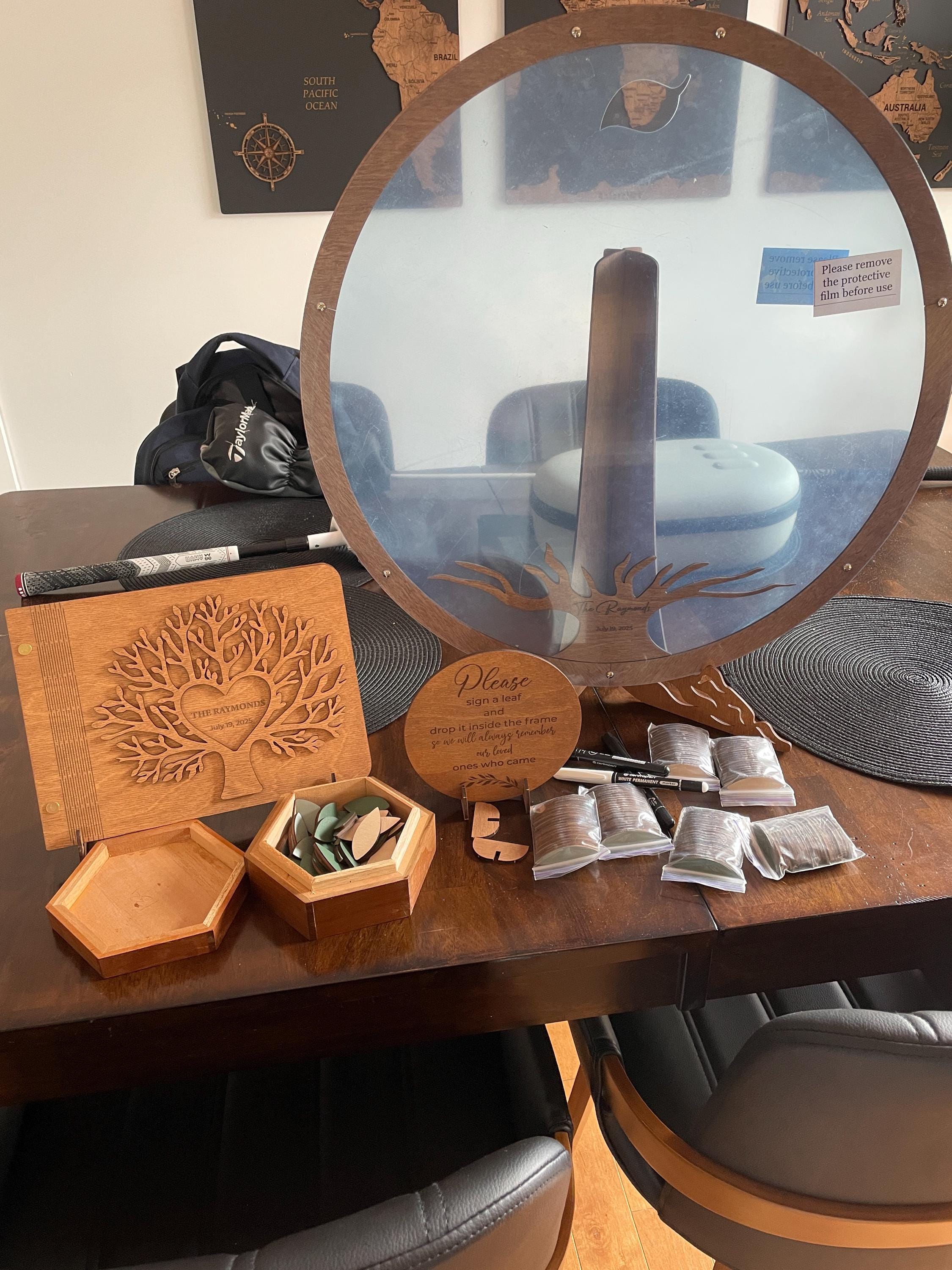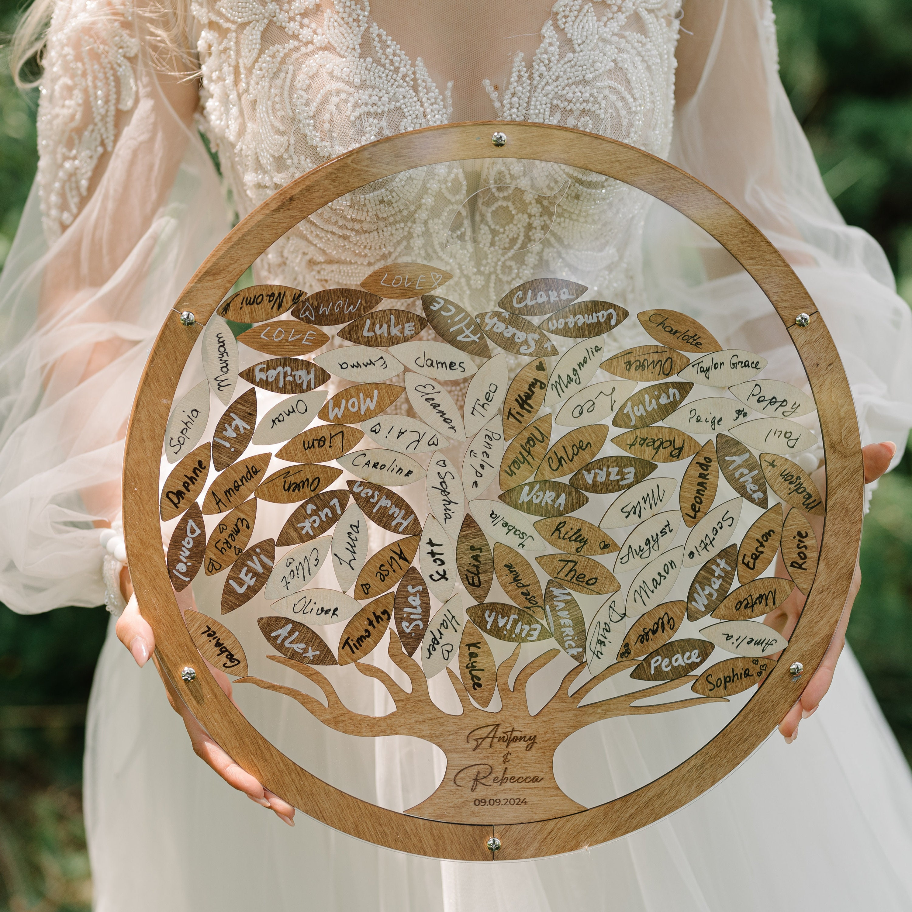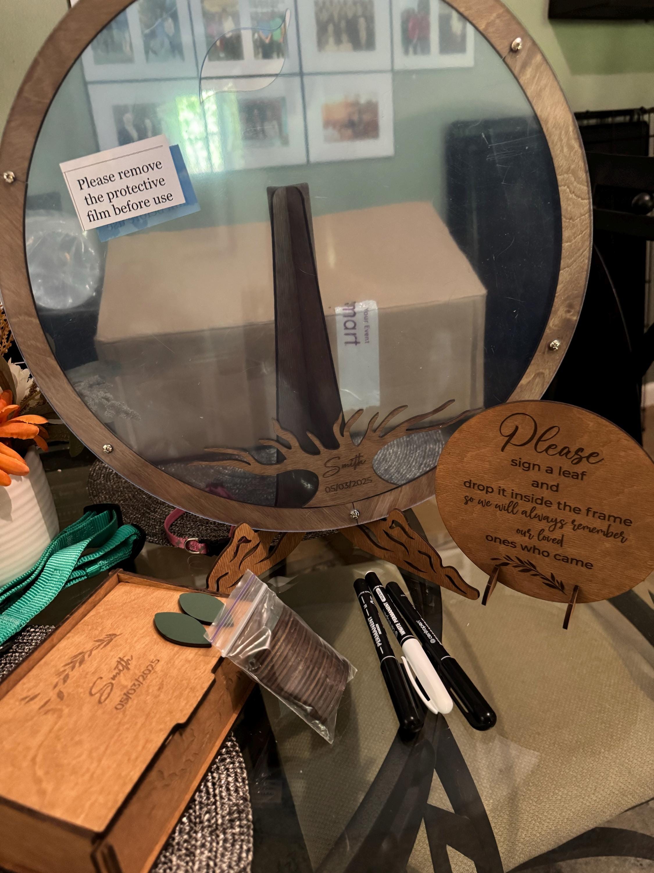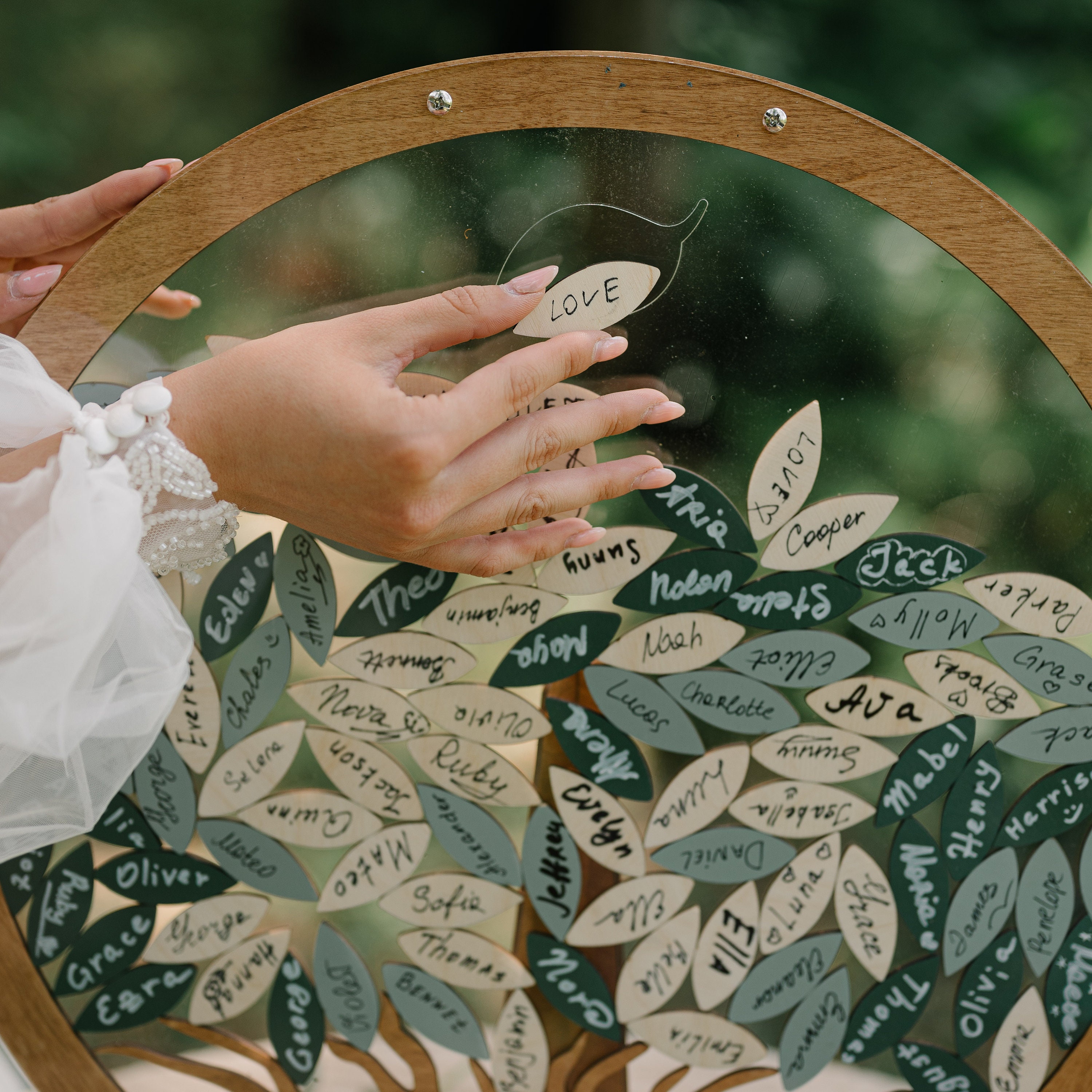 Wie funktioniert diese Alternative zum Hochzeitsgästebuch? Ihre Gäste unterschreiben kleine Holzblätter und werfen sie in die Dropbox. Die Größe der Dropbox-Rahmen variiert und hängt von der benötigten Anzahl der Blätter ab. Je mehr Blätter Sie für Gäste auswählen, desto größer wird Ihr Schild. Der Tischständer ist in zwei Varianten erhältlich: Holz oder Acryl. Ein Ständer, eine Box und ein Schild mit der Aufschrift „Bitte tragen Sie sich in unser Gästebuch ein“ sind weitere Optionen.