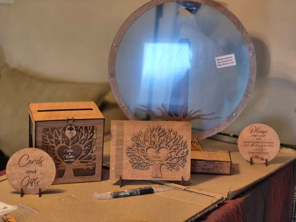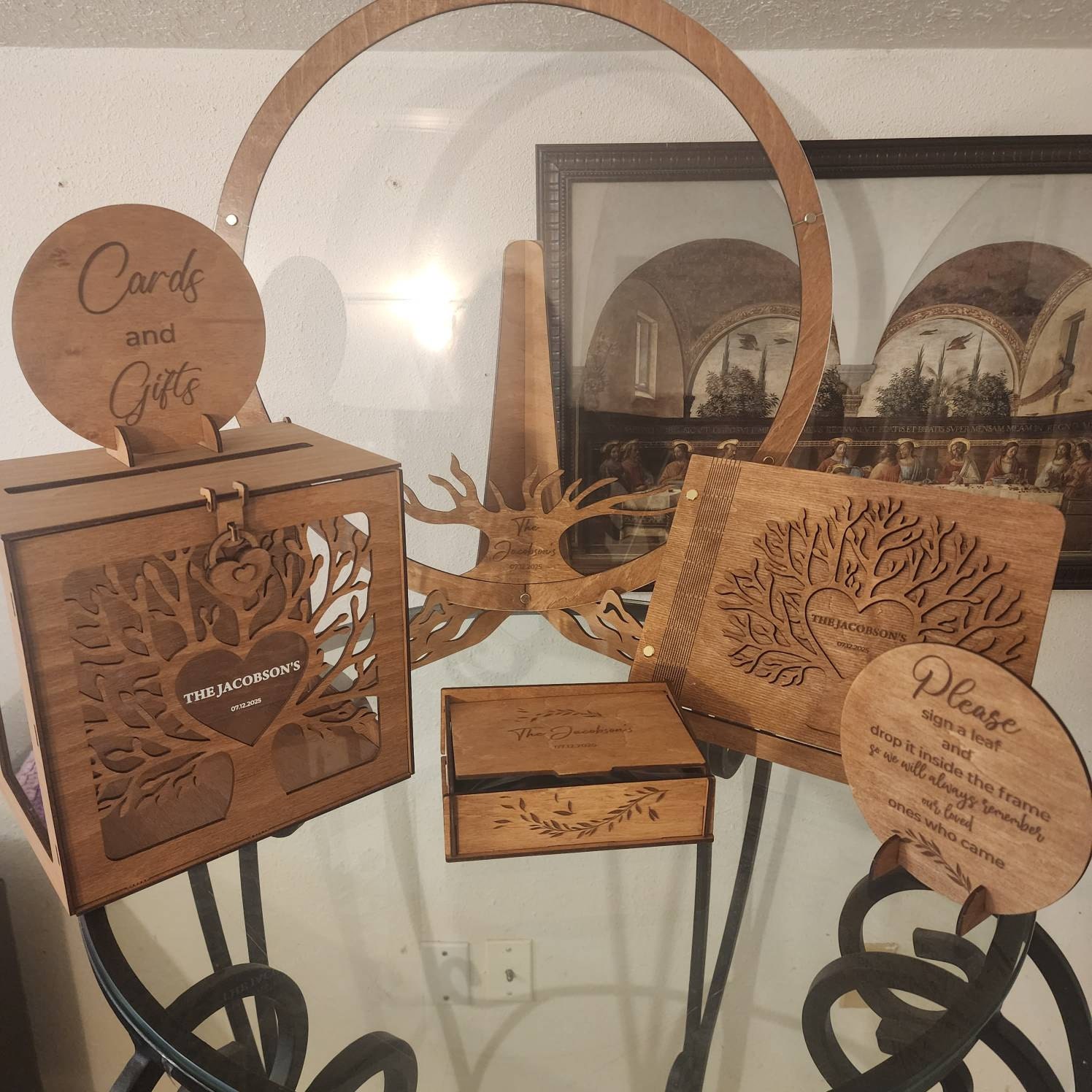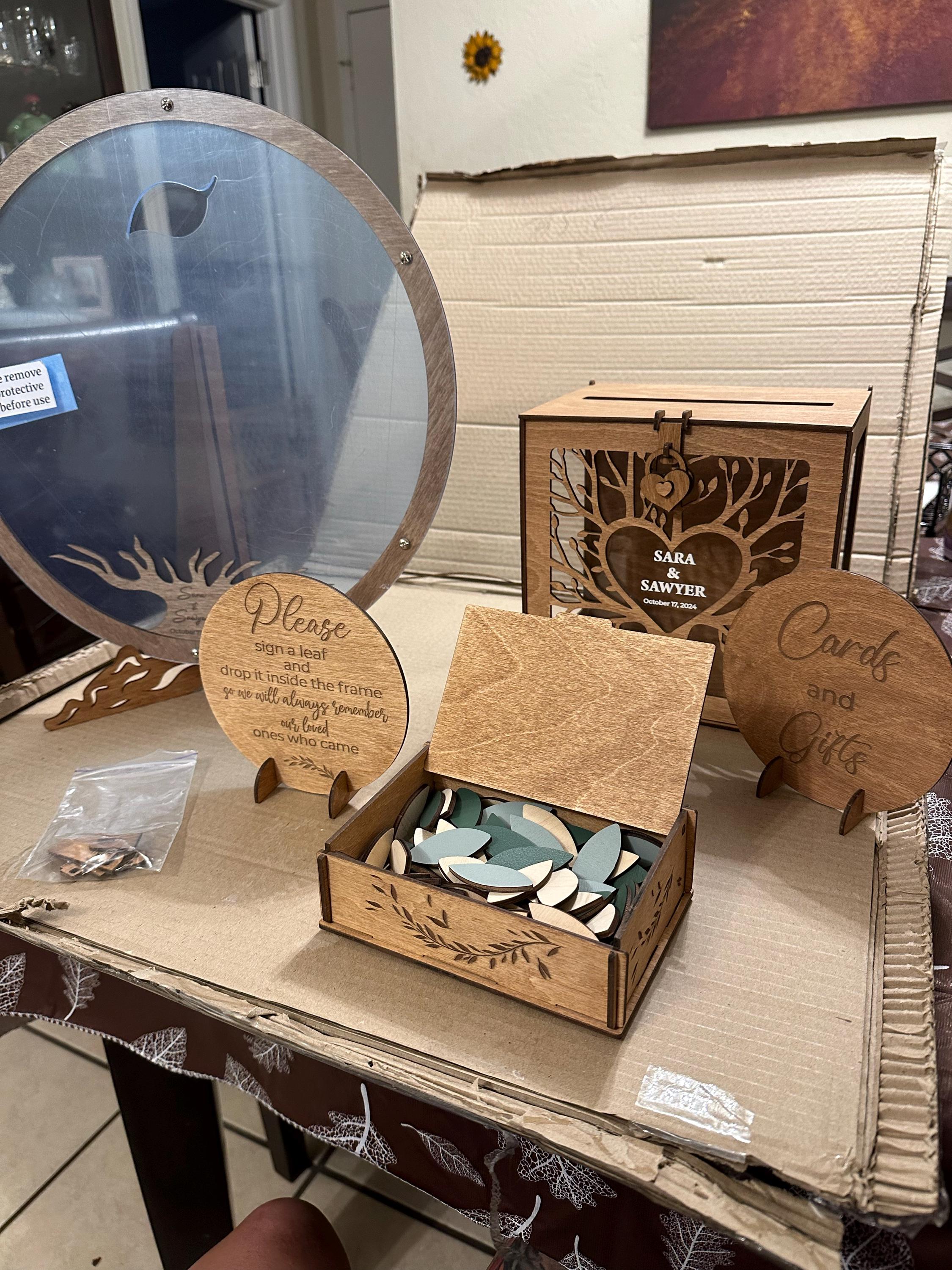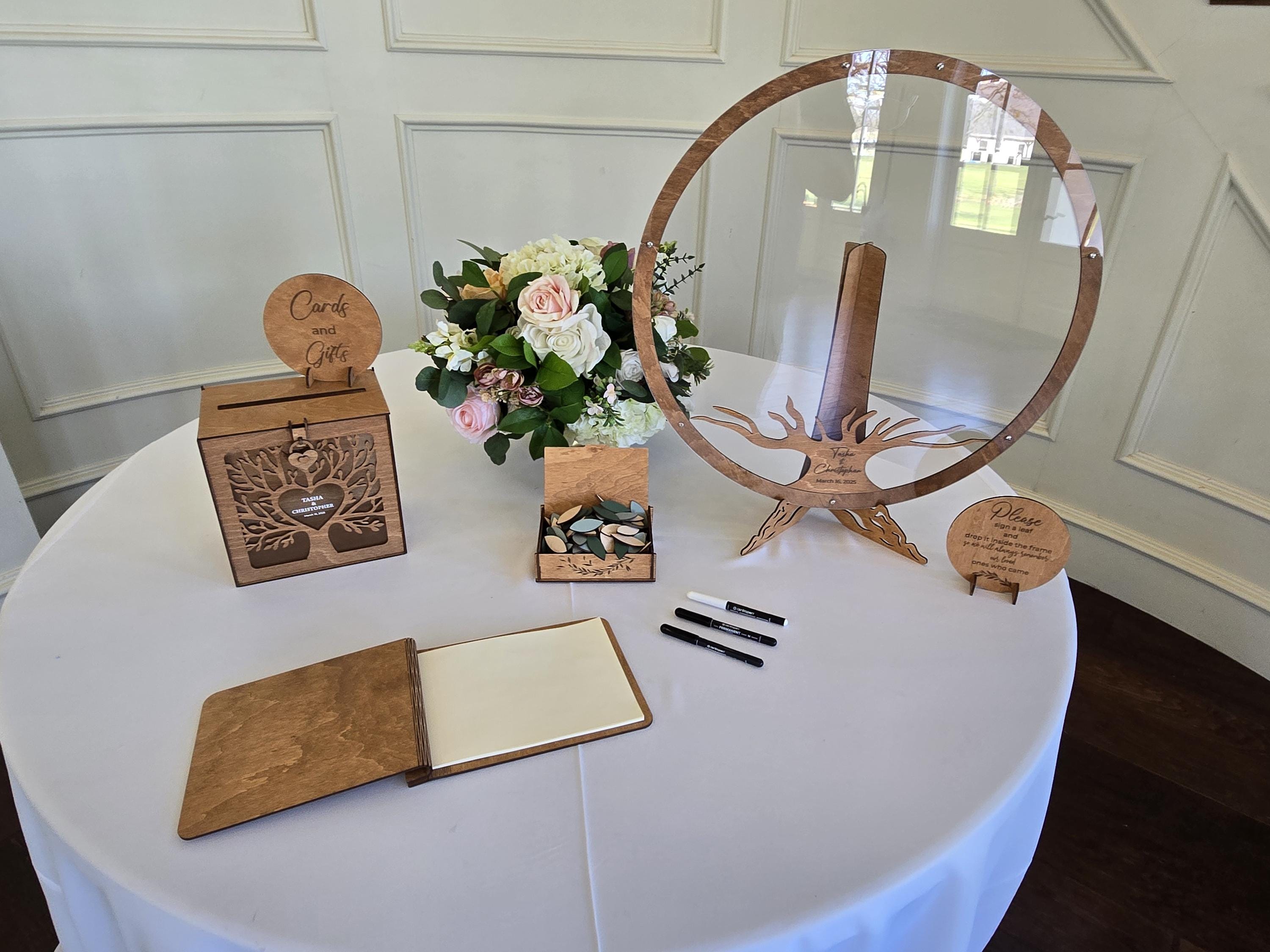 Wir präsentieren Ihnen eine perfekte Kombination aus Holzdekoration für Ihren unvergesslichen Tag. Eine Alternative zum Gästebuch und einem rustikalen Hochzeitsnotizbuch, kombiniert mit einer Hochzeitsbox mit Karten und Geschenken. Die ideale Kombination aus Acrylschildern und Holzelementen wird zum Herzstück Ihrer Hochzeit.
