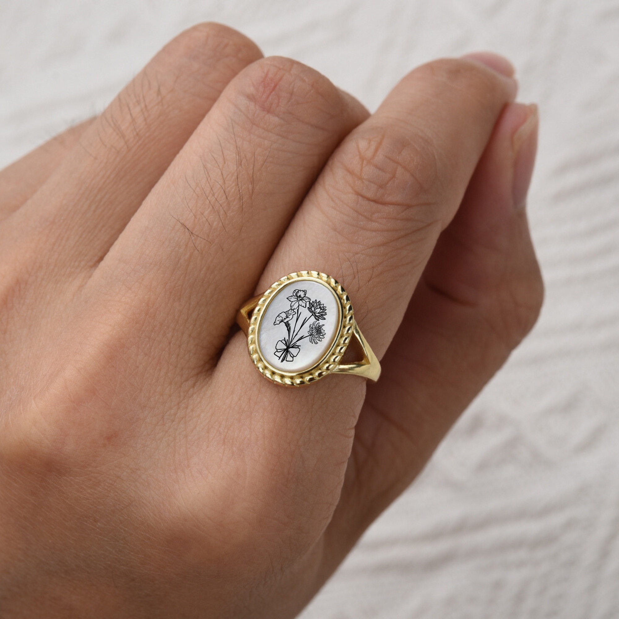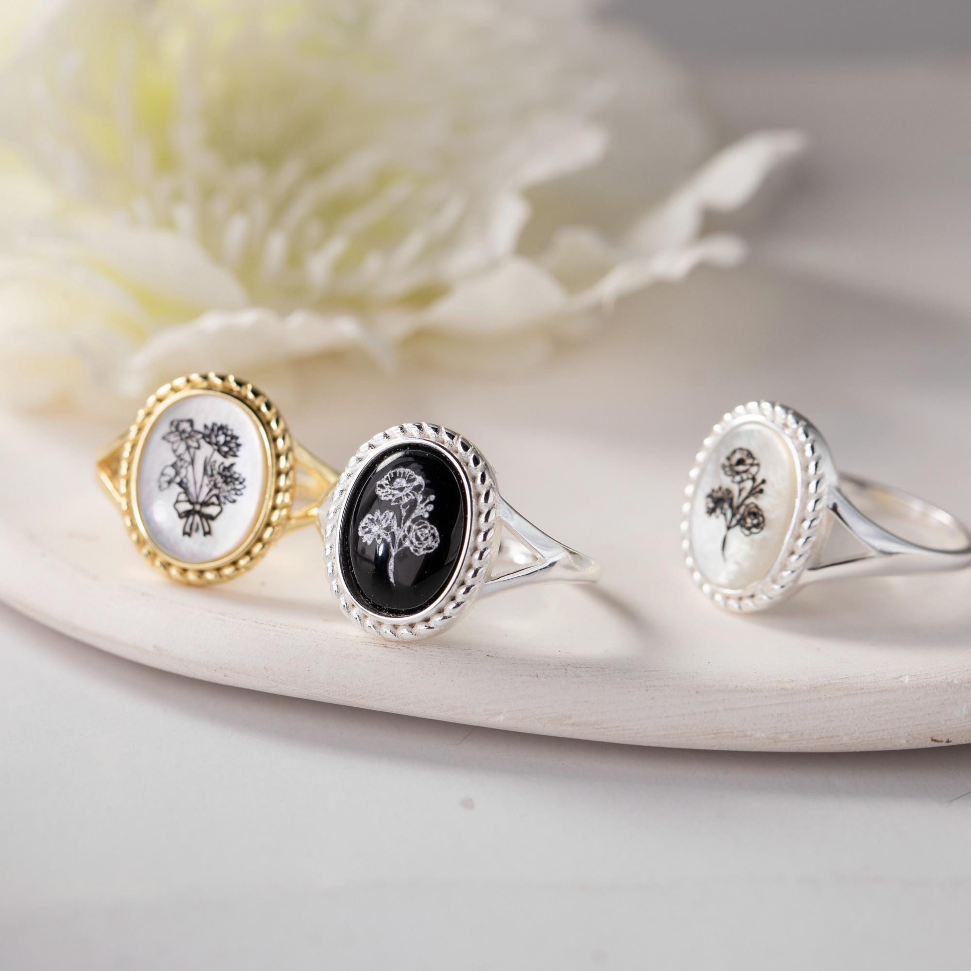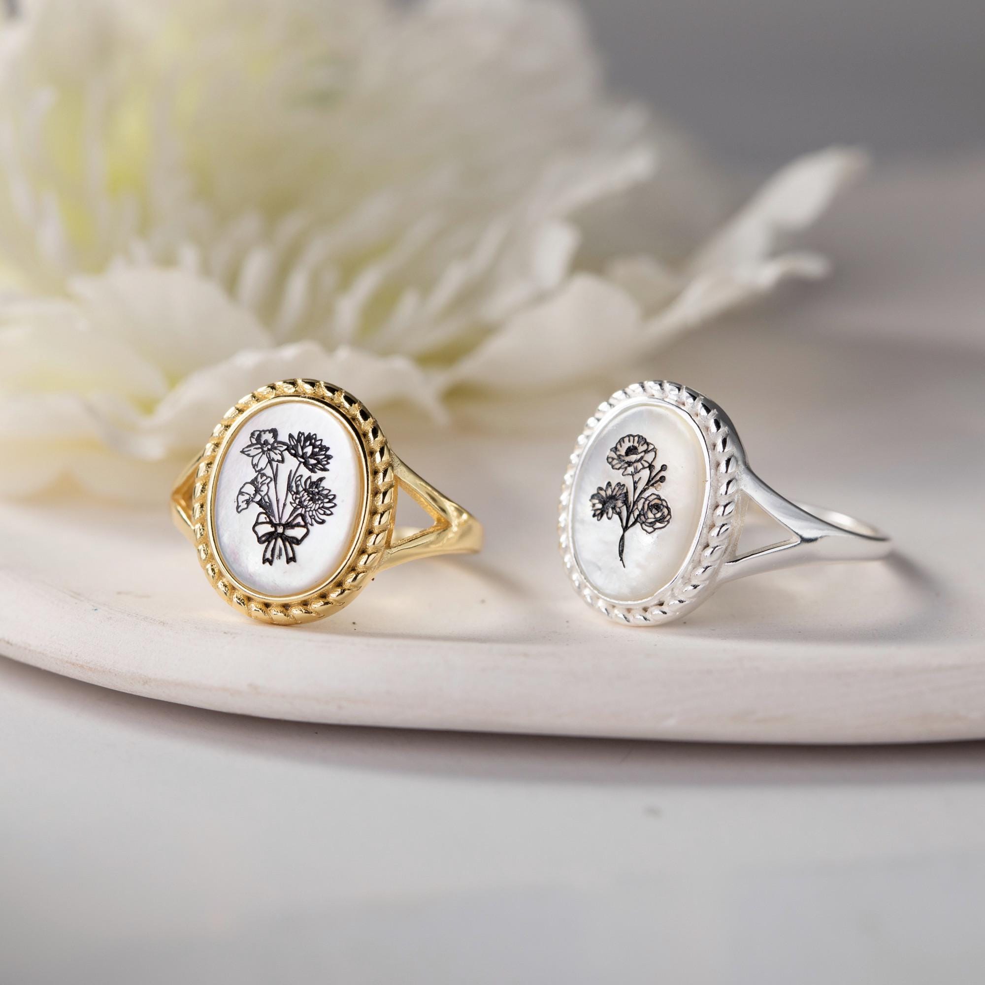 Unser personalisierter Geburtsblumenring ist das perfekte, trendige Geschenk für Ihre Mutter, Schwester, Großeltern, Brautjungfer oder enge Freundin. Jeder personalisierte Ring in Premiumqualität kann mit 1–5 Geburtsblumen personalisiert werden. Wir bieten 12 verschiedene Geburtsblumenarten an.